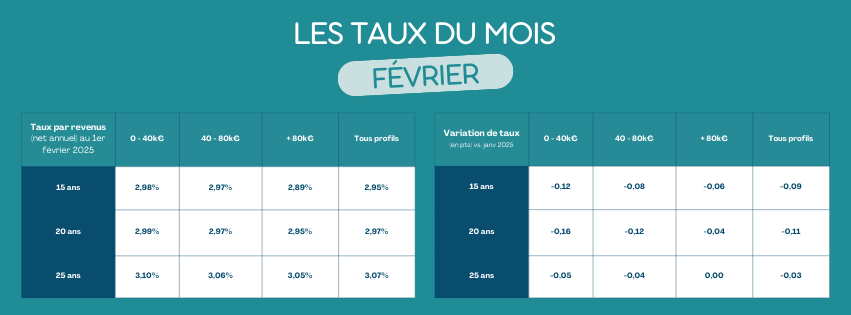 Le mois de février marque une forme de pause. Les taux ne reviennent pas aux niveaux historiquement bas connus par le passé, mais ils cessent de progresser. Cette stabilité redonne de la visibilité aux emprunteurs et permet de relancer des projets qui avaient parfois été mis en attente ces derniers mois.